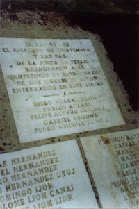 «El 25 de marzo de 1982 el ejército de Guatemala y las PAC [Patrullas de Autodefensa Civil] de la finca La Perla masacraron a 69 campesinos de Ilom-Chajul, de los quales 51 están enterrados en éste lugar [cementerio de Ilom].