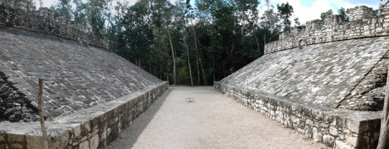 Joc de pilota a Cobán, Alta Verapaz (Guatemala. No confondre amb Copán, Honduras). [clicar amb el botó dret del «ratolí» per veure la imatge en gran i apreciar millor els marcadors de pedra amb forma d’aro].