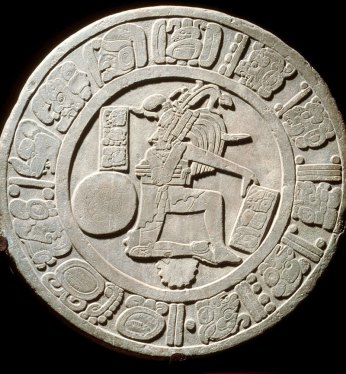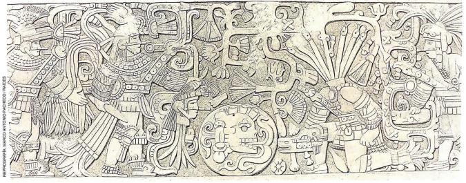 Imatge relleu adalt [clicar amb el botó dret del «ratolí» per veure la imatge sencera]: «En los paneles del juego de pelota de Chichén Itzá se representó a los jugadores durante un sacrificio. Del cuello del tercer personaje (de izquierda a derecha), ya sin cabeza, brotan seis cabezas de serpiente y un motivo vegetal, símbolos de la sangre que propiciará la renovación de la vida y la vegetación».